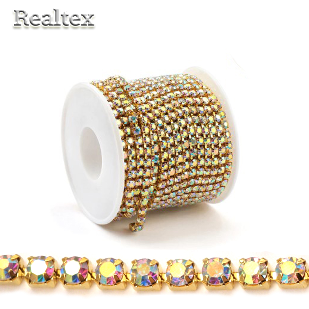 Основа металл.Тесьма-стразы Realtex SS-14 3,5мм (оригинал-стекло) цв.золото/crystal AB - изделие обладает оптимальным сочетанием цены и качества, приобрести которое можно оптом и в розницу с доставкой по всей России в интернет-магазине Realtex