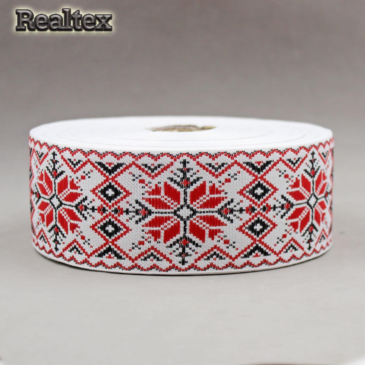 Тесьма жакардовая 50мм с3379г17 рис.9837 (25м) цв.белый/красный/черный - изделие обладает оптимальным сочетанием цены и качества, приобрести которое можно оптом и в розницу с доставкой по всей России в интернет-магазине Realtex