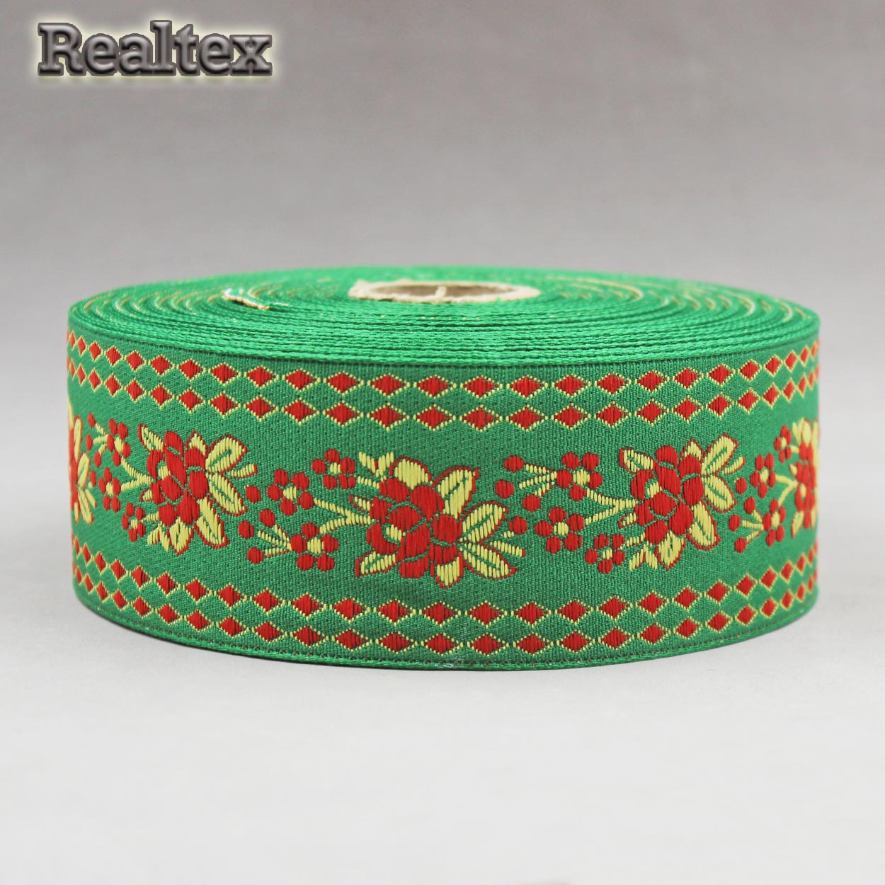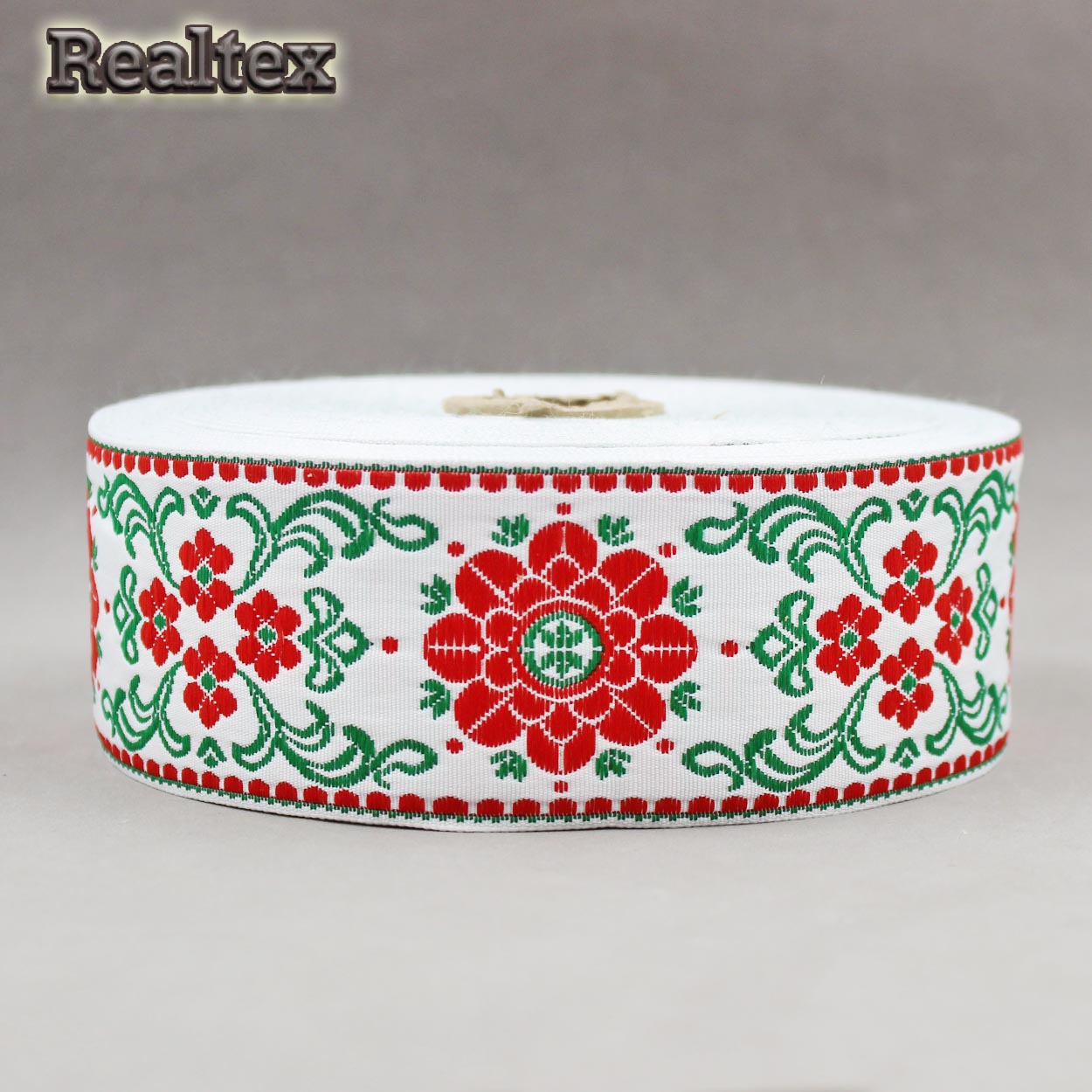 Тесьма жакардовая 50мм с3379г17 рис.9600 (25м) цв.белый/зеленый/красный
