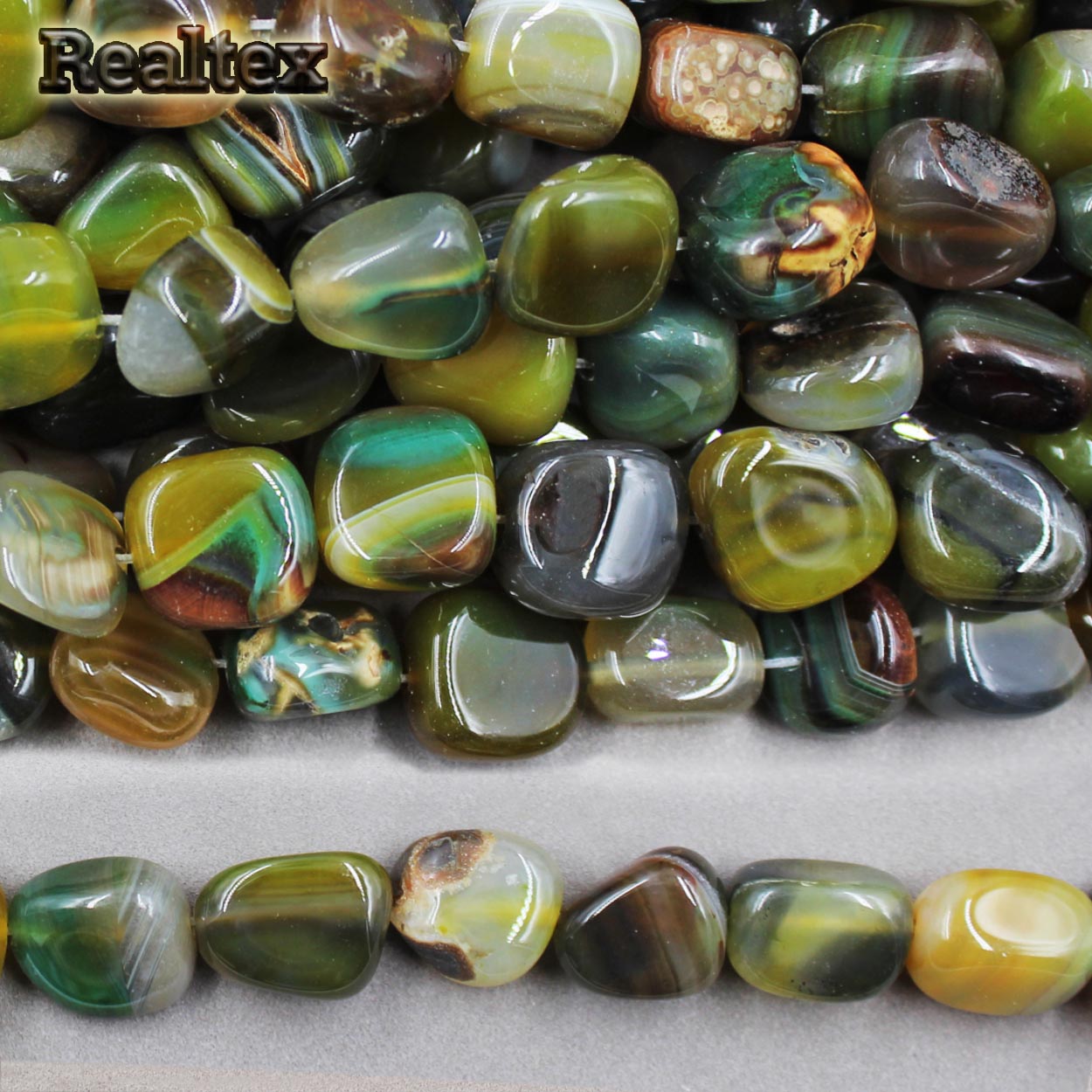 - Бусины Реалтекс из натурального камня Агат галтованного 9*15мм дл.37см (24шт) цв.оливковый mix