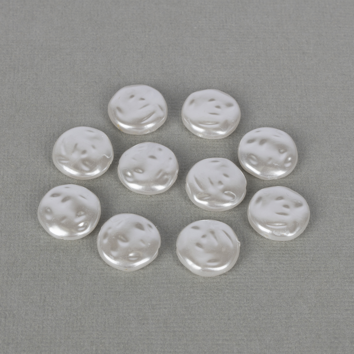 Бусина пластик под жемчуг в форме плоского круга. Используются для изготовления бус, браслетов, колье и др. бижутерии, декоративного украшения одежды, аксессуаров и т.д.