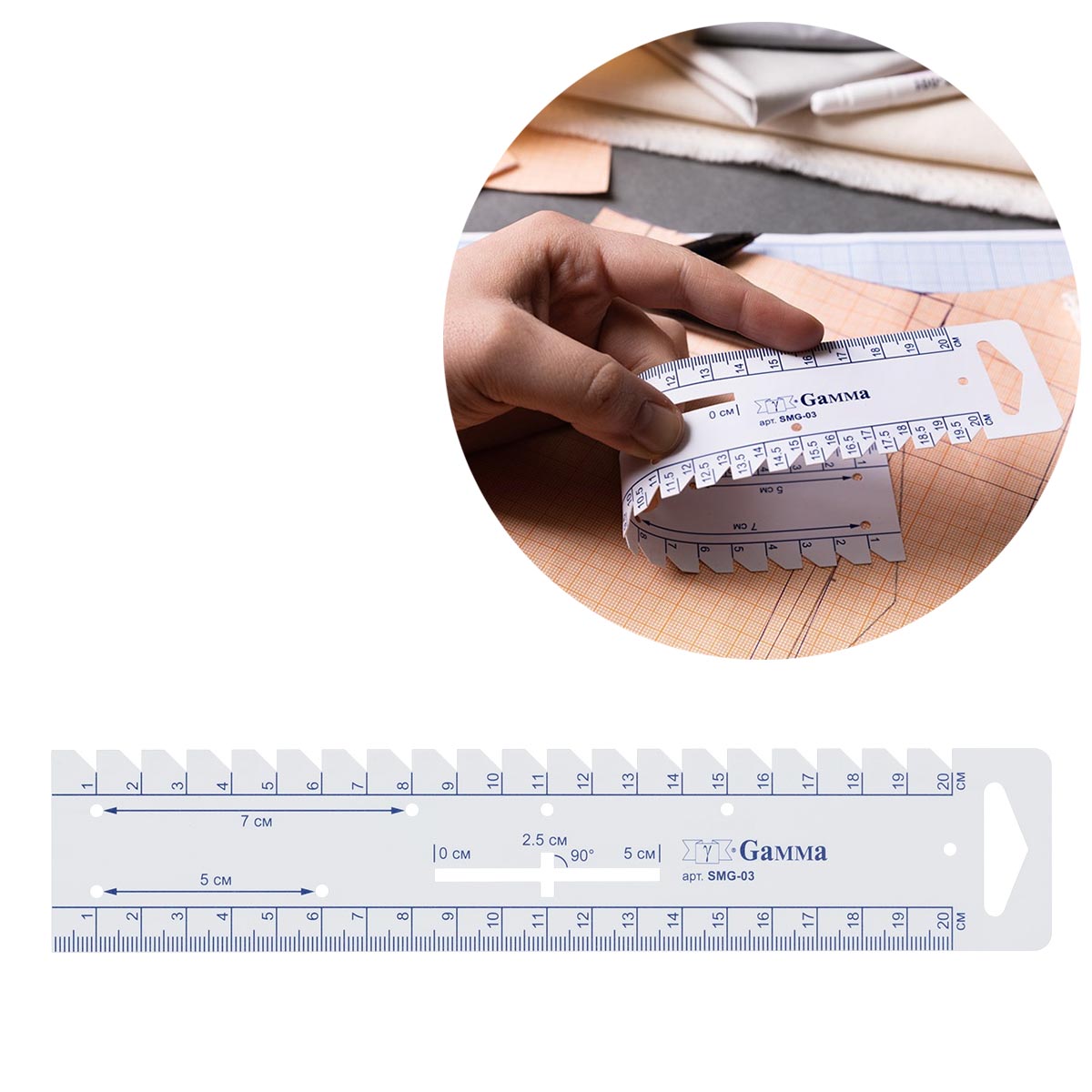 Линейка SMG-03 Gamma предназначена для быстрого и точного нанесения разметки и проведения необходимых замеров при шитье, вязании и работе в техниках пэчворк и квилтинг.